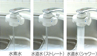 イージーレバーは水素水( ストレート)、水道水( シャワー) とレバーひとつでカンタンに切り替えることができる優れものです( 標準装備)。また、スケルトンウィンドウからは、水素が気泡となって発生する様子が目で確認できます。