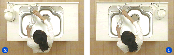 お客様のキッチンレイアウトに合せて、水栓金具の左右どちらにも設置が可能です。